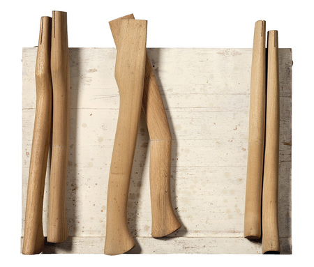 geweißtes Holzbrett mit Leiste als Objektträger; auf Leiste als Stufe: 6 holzfarbene Beilstiele zu 3 treppensteigenden Beinpaaren angeordnet- WV-Nr: O-1979-19