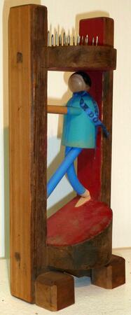 Holz ( Innenseiten kraplackrot bemalte, offene Form, blau und türkis bemalte Figur, Kugel als Kopf), Nägel auf dem "Dach", Spitzen nach oben zeigend, Acrylfarben- WV-Nr: O-2000-926