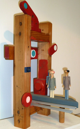 Holz (Rahmen, scheibenförmige, rot, weiß, türkis, grau bemalte Teile, grau, blau, weiss, ornage, schwarz bemalte Spielzeug-Figuren, Aluschienen, Acrylfarben- WV-Nr: O-2000-928