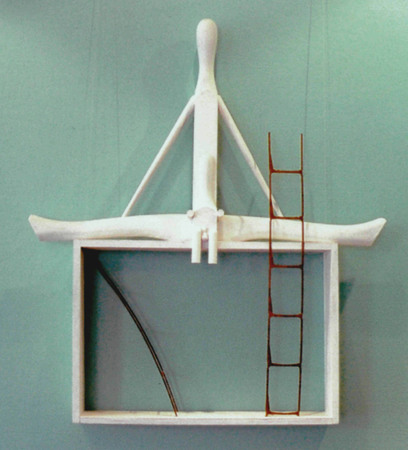 Titel: Nackte AkrobatenHolzrahmen, 2 Holzfiguren, Metalleitern WV-Nr: O-2001-955 Gattung: Objekt Jahr: 2001 Maße: 71 x 62 x 10 Standort: HR